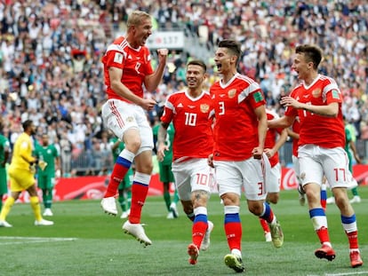 Gazinskiy, Cheryshev (duas vezes), Dzyuba e Golovin marcaram na goleada russa em estreia no Mundial