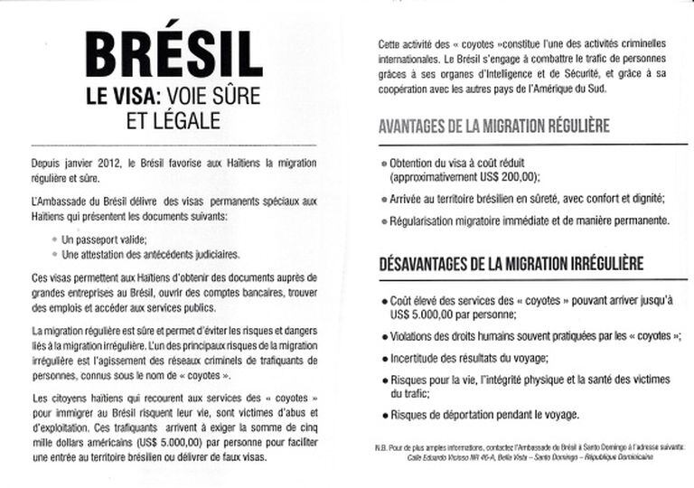 Visto para Brasil a um custo reduzido de 400 reais (200 dólares) para os haitianos, assegura, segundo as autoridades brasileiras: