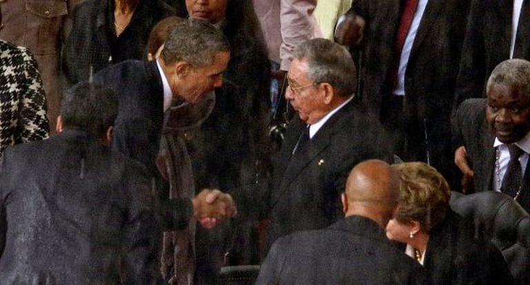 A cena transcorreu assim: logo depois de subir rapidamente as escadas que conduziam à tribuna dos mandatários convidados à homenagem ao falecido líder sul-africano Nelson Mandela, o presidente dos Estados Unidos, Barack Obama, se dirigiu diretamente ao presidente de Cuba, Raúl Castro. Apertou-lhe a mão e ambos trocaram algumas palavras, inaudíveis para o público, que a intérprete de Raúl Castro, Juanita Vera, traduziu de imediato. Depois, o presidente Obama cumprimentou com um beijo a presidente Dilma Rousseff, enquanto Raúl Castro o seguia com o olhar e com um sorriso sob seu bigode ralo. Tudo se passou em sete segundos.