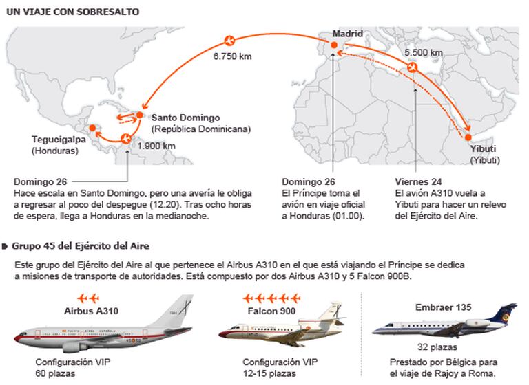 A Defesa já tem um plano para evitar que se repitam incidentes como o sofrido pelo Príncipe Felipe em sua recente viagem a Honduras: comprar dois Airbus 330-200 MRTT. A missão principal destes aviões não será o transporte de personalidades, senão o reabastecimento em voo, substituindo os dois velhos Boeing 707 cisterna do Exército do Ar; um já de baixa e o outro a só dois anos de sua aposentadoria. Mas os A330 também podem operar como transporte VIP e reforçar, em caso de avaria ou manutenção, os dois Airbus 310, que estão no meio de sua vida útil. Isso sim, os novos aviões custam cerca de 200 milhões por unidade e será preciso esperar ao menos até 2016 para os comprar.