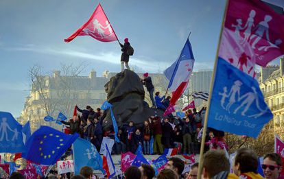 Depois da Marcha Pró-Vida, de 19 de janeiro, e a chamada Jornada da Ira, que reuniu em 16 de janeiro 17.000 pessoas em Paris para protestar pela pressão fiscal ––a marcha degenerou em slogans antissemitas, racistas e homofóbicos, houve distúrbios e 250 prisões––, no domingo foi a vez de mais de 100.000 cidadãos pacíficos, muitos deles crianças, jovens e avós.