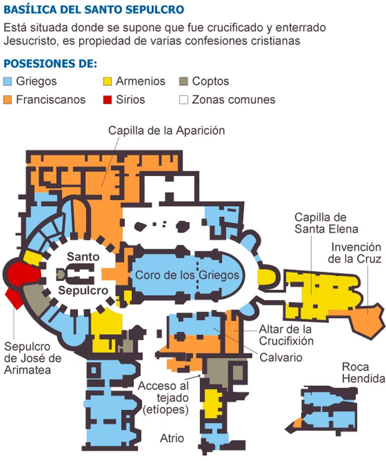 GREGOS. A chamada Irmandade do Santo Sepulcro controla a maior parte do templo, que os gregos ortodoxos chamam de Igreja da Ressurreição. Sob sua custódia está, entre outros, o Calvário, a rocha na qual se levantou a cruz de Cristo; a pedra da unção do corpo de Jesus e o acesso à edícula onde está seu túmulo. No Katholicon ou, Coro dos Gregos, está o Onfalo, um ponto que várias referências bíblicas consideram o centro do mundo.