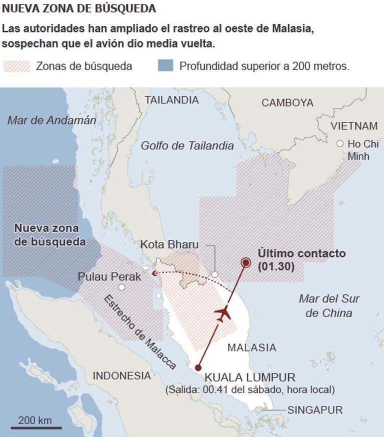 A companhia aérea Malaysia Airlines afirmou na terça-feira que “as equipes de busca e resgate ampliaram o alcance para além da rota do voo”. “O foco está agora no oeste peninsular da Malásia e no estreito de Malaca. As autoridades estão considerando a possibilidade de que o voo tentou regressar a Subang (Malásia). Estão olhando para todas as possibilidades". Isso inclui, desde esta quarta-feira, também o mar de Andamão, ao norte do estreito de Malaca. O Governo solicitou a ajuda de Índia para ampliar a zona de busca.