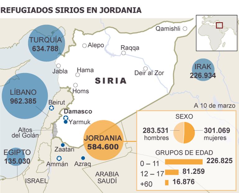 A terra jordaniana é árida, seus recursos aquíferos limitados. A economia também já não pode absorver a presença de cerca de 585.000 sírios chegados pela fronteira norte e repartidos entre os campos de refugiados, onde sobrevivem 20%, e as cidades, nas que tratam de sair adiante os 80% restantes. Alguns vão diretamente para a casa de seus familiares em Ammán, Mafraq, Zarqa... Outros se lançam à aventura e fogem sem demora das lojas de Zaatari ante a massificação. Mas para muitos não há opção: vivem embaixo das lonas com selo da ONU, esperam a ração de comida e água, abrem seus comércios, mesquitas, jogam nos campos de futebol, levam às crianças à escola…