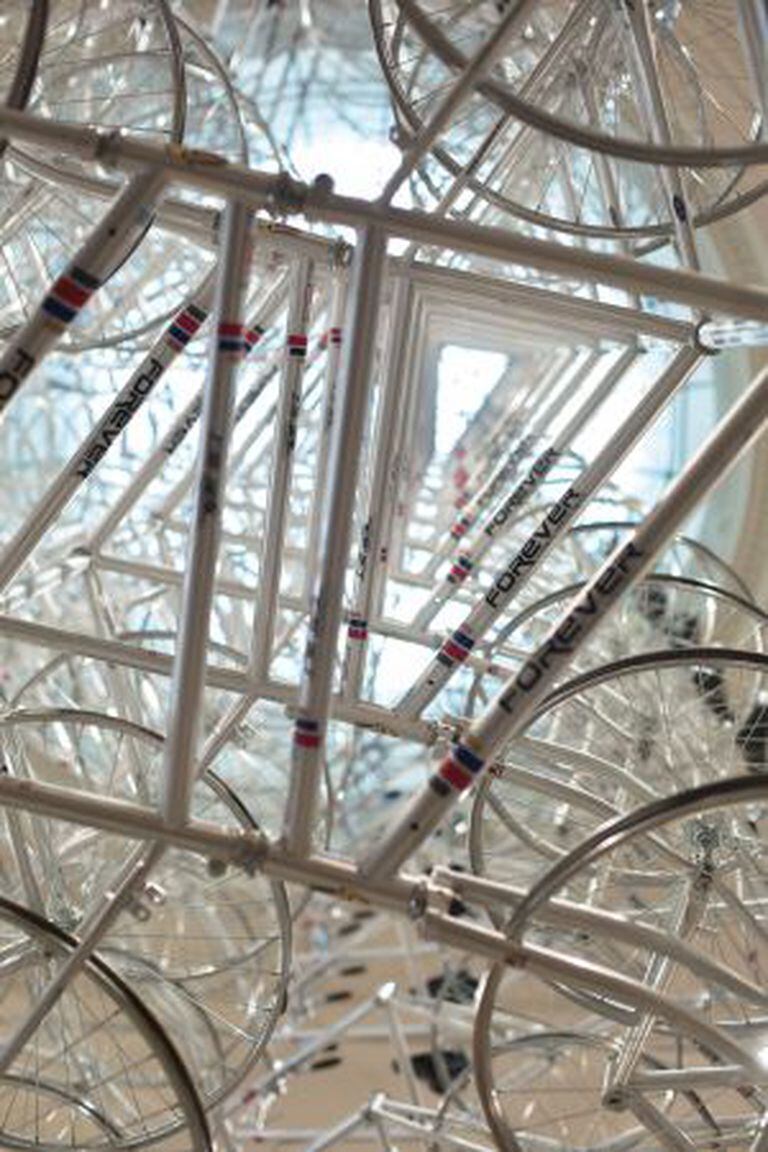 Por exemplo, a escultura que enfeita a entrada do museu e que está formada por 150 bicicletas da marca Forever. Embora a escultura que dá as boas-vindas ao visitante parece ser alegre e simplista, a obra está dedicada a um tal Yang Yia, um chinês que foi executado em Shangai por um crime que nunca cometeu. Seu erro foi ter usado uma bicicleta que não estava registrada.
