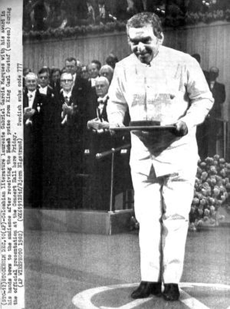 Em 1982 recebe o Nobel. Está no México e de madrugada lhe anunciam o prêmio. Com 55 anos, se transforma em um dos escritores mais jovens a receber a honraria máxima da literatura. Em dezembro, rompe com a tradição ao receber o prêmio vestido de liquiliqui [traje típico da Colômbia] e pronunciar um dos mais lembrados discursos de aceitação, Brinde à Poesia (também conhecido como A Solidão da América Latina). Um aceno aos seus primeiros passos no terreno da literatura: