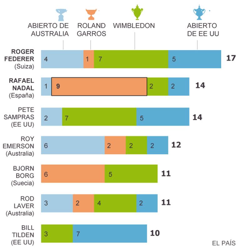 Deste material estão feitas as lendas. Quando Rafael Nadal comemora o resultado de 3-6, 7-5, 6-2 e 6-4 e seu nono Roland Garros, já superou o temido Novak Djokovic e mil e uma barreiras de dor, penalidades e sofrimento: com dores nas costas e com um o joelho assustando no set decisivo, o espanhol é capaz de igualar-se a Pete Sampras como o segundo tenista com mais títulos da máxima categoria (14 contra 17 de Roger Federer), subindo pela primeira vez ao pódio desde 2009, quando foi a vez de Djokovic. O título permite ao espanhol continuar como número um. O troféu, além disso, o coroa com a marca dos melhores valores do esporte. Seu reino de terra, finalmente, o classifica aos 28 anos como o único tenista capaz de ganhar troféus do Grand Slam por 10 anos seguidos. Tudo, com ranger de dentes e deixado a alma sobre as quadras: Djokovic chegou a conseguir um break de desvantagem no set decisivo.