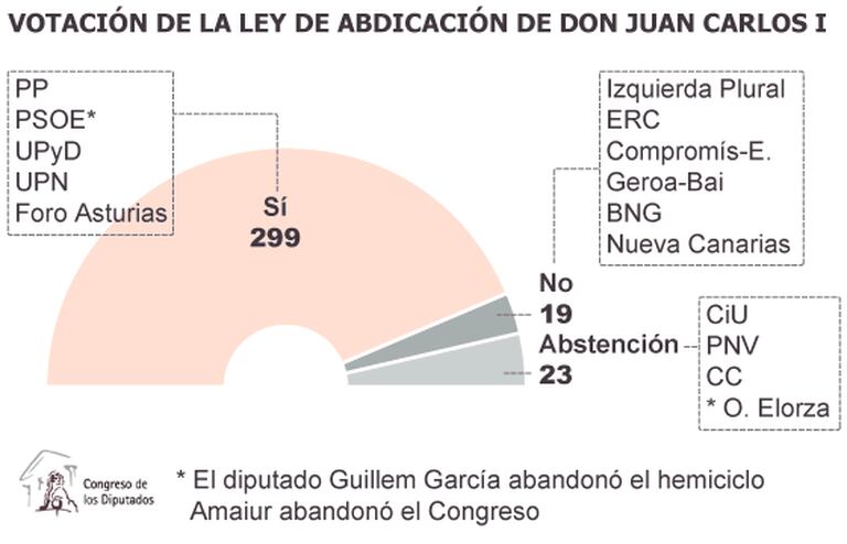 A Câmara aprovou a lei de abdicação, a norma mais curta e mais transcendente das últimas décadas na Espanha, em um ambiente de solenidade que terá continuidade no dia 19 com o ato de proclamação do novo rei Felipe VI. O único sobressalto foi o voto dos socialistas Odón Elorza e Guillem García: o primeiro se absteve rompendo a disciplina do voto, e o segundo, que pediu liberdade para votar, não esteve presente. Ambos serão multados em 400 euros.