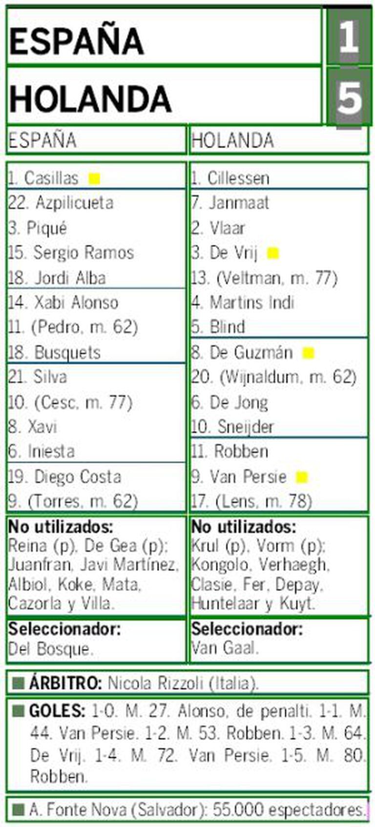 A tragédia espanhola pode deixar marcas. Será preciso ver se a Espanha está diante do ocaso da melhor seleção da sua história, ou se o grupo ainda é capaz de levantar-se da lona depois de um castigo semelhante. Diante da repentina avalanche holandesa do segundo tempo, a equipe de Del Bosque não teve tempo nem de se refugiar nas cordas. Os oranje passaram quatro anos ruminando um segundo ato, mas nem em seus melhores sonhos podiam imaginar o que se viu na Fonte Nova. Os meninos de Van Gaal terminaram o jogo triunfalmente diante da sua paróquia, que esfregava os olhos.