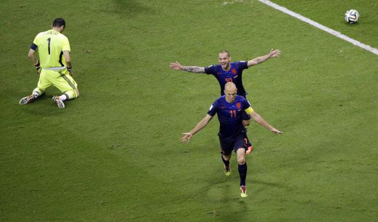 De nada serviu à equipe de Del Bosque sair na frente no placar, com um pênalti que Diego Costa tirou da cartola. A Holanda se vingou com sanha da derrota de quatro anos atrás, na África do Sul, e, com Robben à frente, deixou a Espanha com as calças na mão, feito um boneco de pano a mercê de um adversário que, no segundo tempo, foi um enxame. Não houve espanhol reconhecível. Nem uma migalha dessa equipe que competiu de forma sublime na Eurocopa de Viena. A Espanha foi uma hemorragia, calamitosa em todas as suas linhas, e terminou no chão, como um farrapo. Casillas não era nem a pior sombra de Casillas; Ramos, em sua melhor temporada, parecia estar na pior; Iniesta não era Iniesta… Assim, um após o outro. Costa não foi uma solução, e na costa de Casillas tudo foi grotesco. Não foi só uma tarde ruim; foi uma sessão de terror.