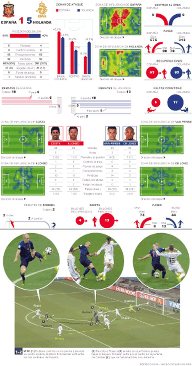 Era inconcebível pensar que o gol do empate de Van Persie, pouco antes do intervalo, poderia ter um efeito tão devastador para uma equipe como a espanhola, que é experiente e sabe quase tudo. O gol do capitão holandês foi o prelúdio do que ia chegar. Diante de um cruzamento de Blind da lateral, Piqué não se entendeu bem com Ramos, que partiu tarde demais, enquanto Casillas ficou plantado perante a chegada do rival. A execução de Van Persie, com uma cabeçada milimétrica sobre Iker, foi soberba. Estivesse o goleiro espanhol dois passos atrás, a Holanda não teria cantado bingo.