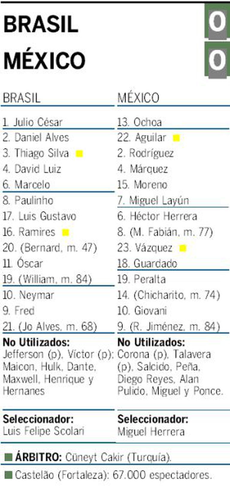 Na outra área, Márquez deu uma lição de colocação e têmpera, bem escoltado por Héctor Moreno e Maza Rodríguez. Essa defesa de três zagueiros sepultou Fred e foi um muro para Neymar sempre que ele tentou superá-la com arrancadas individuais. Scolari, que colocou algo mais de futebol quando permitiu a entrada de Bernard no lugar de Ramires, após o intervalo, levantou os polegares festejando o empate. Chicharito e Raúl Jiménez, já nos descontos, colocaram o Brasil à beira de uma derrota que teria gerado um terremoto.
