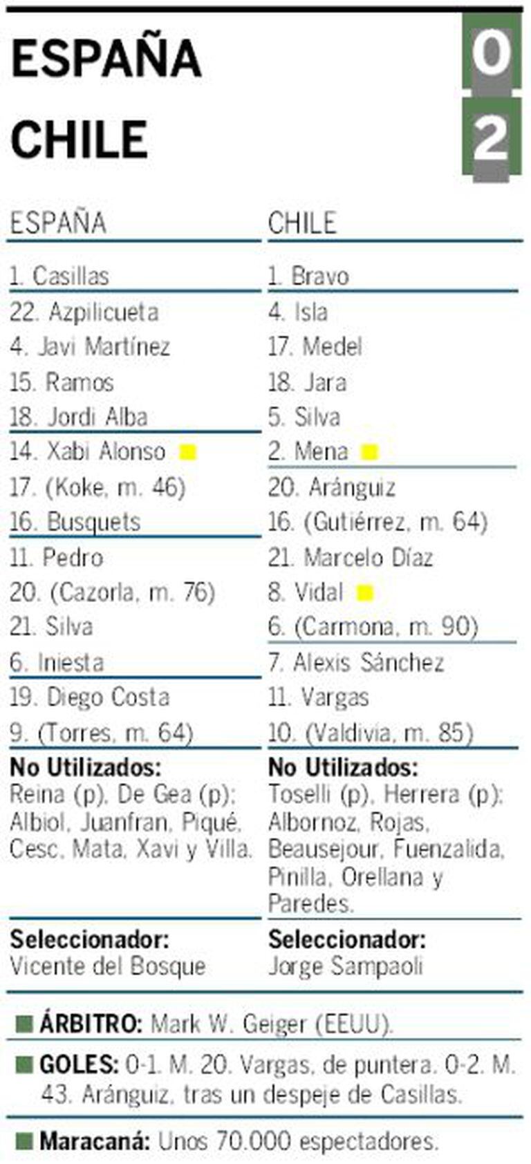 O fato é que no Rio, desde o apito inicial da partida, a Espanha foi uma equipe trêmula, daquelas que se sentem vulneráveis e dão todas as pistas ao adversário. Uma Espanha desconhecida, capaz de provocar uma entorse na bola em passes primários, sem o peso do Chile, que com sua resistência vietnamita se impunha em cada disputa. Se ante a Holanda ainda fez um primeiro tempo bonito, com o Chile pela frente não mostrou nada, carente de fagulha e de corpo, sem toque, sem tiki, sem arremate. O grupo espanhol tremia até os cadarços, e já no primeiro minuto a defesa deu um nó e Alba quase bate Casillas. A Espanha não encontrava o seu ritmo, o Chile havia decretado sua prisão em todas as zonas do campo. A Roja não encontrava a maneira de subordinar passes, sua especialidade, e perdia o confronto a cada avanço. Vários couberam a Xabi Alonso, e em uma perda de bola se originou o primeiro gol sul-americano. O erro de Alonso desencadeou uma defesa caótica da jogada, até que Vargas tocou para o gol. Foi o próprio Alonso quem esteve prestes a remediar o primeiro tento, mas Bravo antecipou-se e fechou a porta.