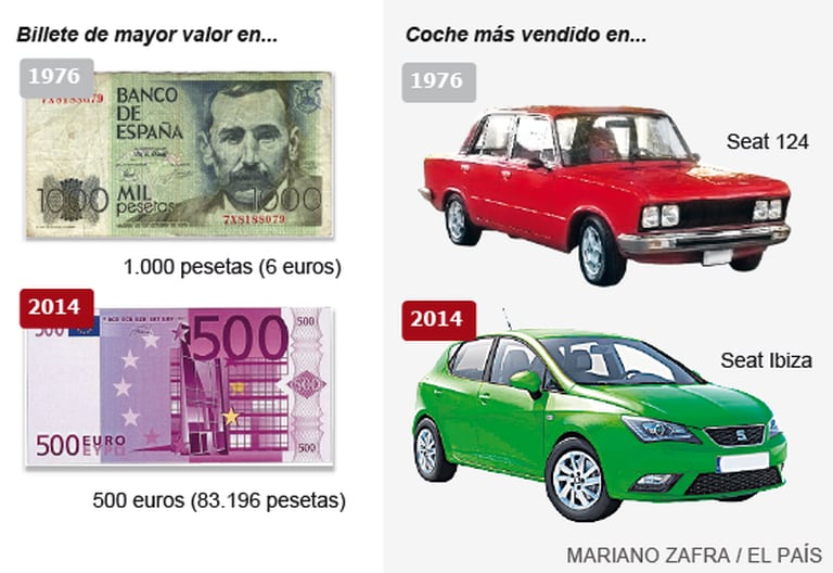 Os primeiros exemplares do EL PAÍS, fundado em maio de 1976, começaram a sair com um preço de 10 pesetas. Nas bancas ele é vendido hoje por 1,30 euros (216 pesetas). O carro mais vendido daquele ano foi o Seat 124. Foram vendidas 43.171 unidades deste modelo que anunciava, na época, “114 cavalos de potência, servofreio a depressão e direção de parafuso rosca sem fim”. Durante aquele ano foram fabricados na Espanha 640.938 modelos das diferentes marcas. Na frente da casa de 1/3 das famílias havia um carro estacionado. Em 2014, outro Seat, o Ibiza, lidera a venda dos utilitários.