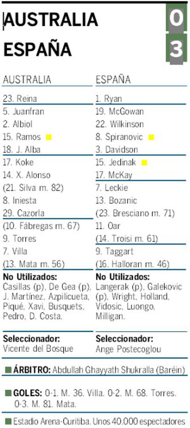 La Roja deixou o Brasil de negro, o luto que merecia após um torturante torneio. Como não há consolo possível, sua vitória contra a entusiasmada e fraca Austrália foi apenas um leve analgésico, um esparadrapo para conter sua hemorragia nessa Copa para esquecer. Irrelevante no coletivo, esta partida escondeu alguns feitos individuais, como os de Iker Casillas e Xavi. O maior desabafo foi para Villa, que encerrou sua carreira na seleção da maneira que sempre foi, um goleador de primeira, o quarto espanhol a marcar em três Copas como Julio Salinas, Raúl e Fernando Hierro. El Guaje (O Garoto, em espanhol) foi o primeiro centroavante de Del Bosque a marcar neste campeonato. Nem Diego Costa nem Fernando Torres haviam conseguido. Eloquente para definir o papelão espanhol no torneio. É paradigmático repassar as quatro grandes assistências que deu Iniesta: Silva perdeu contra a Holanda, Diego Costa desperdiçou contra o Chile e... Villa e Torres marcaram na partida que não valia nada. Ao contrário da arquibancada, a Espanha ainda tinha respeito pelo Brasil, cujos torcedores gritaram com insistência “eliminados, eliminados, eliminados”, e em plenos pulmões o “está chegando a hora”. Brincadeiras e respeito ao mesmo tempo. Quando o futebol causa bocejos, como na partida de sobremesa na ensolarada Curitiba, a torcida aguça a criatividade.