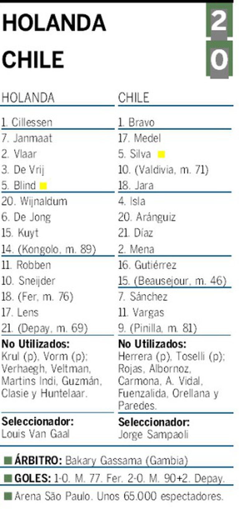 A partida ficou agitada somente com a bola parada e depois de várias mudanças, que foram melhores para a Holanda. Fer marcou em uma estupenda cabeçada no rebote de um escanteio, o Chile se abriu em busca do empate com Valdívia e tomou o segundo gol, obra de Depay.