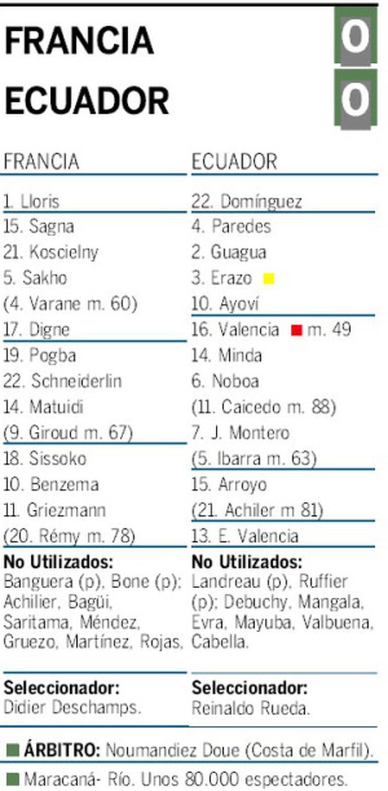 O Equador lutou até lhe restarem forças e saiu do Maracanã com resignação cristã. Faltou um pouco de futebol para coroar seu bom jogo coletivo e notável defesa, cujo mérito foi sobretudo parar Benzema. O atacante francês tocou muito pouco na bola, sem companheiros para jogar com ele, e o plantel de Deschamps não marcou após conseguir média de três gols por partida desde que goleou a Ucrânia em novembro. Ainda que esbanje saúde e disponha de múltiplos recursos, para a França sobraram músculos e faltou talento.