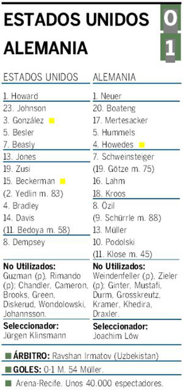 Com o gol Müller e Gana empatando com Portugal, os norte-americanos aguçaram a preocupação. Não tiveram resposta, sem criatividade para harmonizar o jogo, para encontrar os caminhos contra um adversário com poucas brechas. Quando encontrou uma oportunidade única, já nos acréscimos, Lahm se atirou com coragem na frente de uma finalização de Bedoya que ia para o gol. Cristiano, com seu gol, tirou os norte-americanos de sua apreensão. Passado o mal momento alcançaram as oitavas de final como deve ser, com disputa. A Alemanha devia esta honra ao futebol e pagou sua dívida. Em paz.