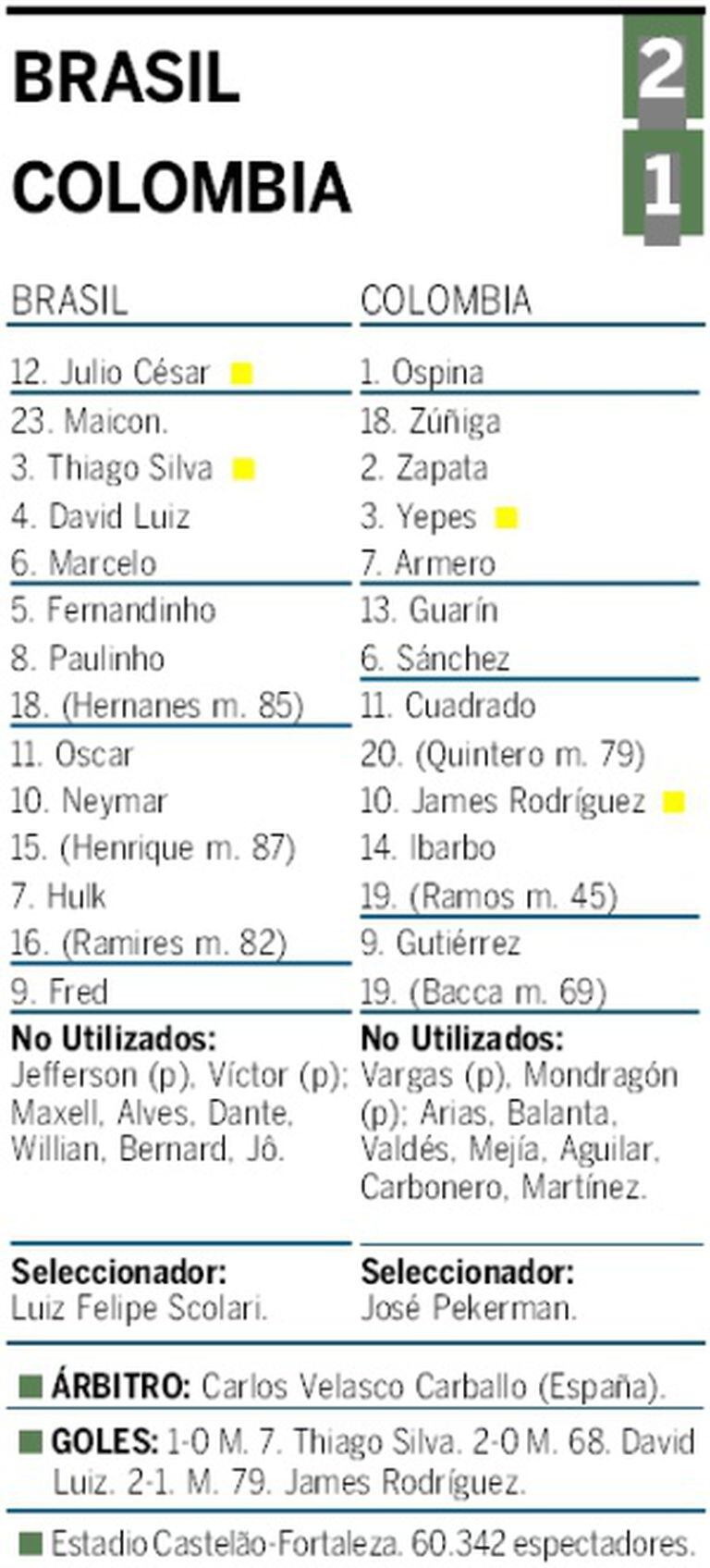 Com jeito ou com força. Assim é este novo Brasil do general Scolari, já na semifinal graças aos seus zagueiros, Thiago Silva e David Luiz, autores dos dois gols dos donos da casa. Num time sem jogadas, a defesa dá as ordens. A Colômbia ficou no vácuo, parca e dominada no começo e sem tempo para uma virada no final. Foi tão curta esta última etapa para os cafeteros como a Copa para James, o diamante lapidado neste mês, que se despede com tantas lágrimas quanto hematomas nas pernas. Este Brasil pode ostentar resultados, mas seu desapego pelo encanto que o distinguia é desanimador. É hoje uma equipe de armadura tosca, pernas de mármore e batedora demais: fez uma falta a cada três minutos, sem que aparentemente o árbitro, o espanhol Velasco Carballo, prestasse atenção à contabilidade. Tampouco percebeu a estocada de Zúñiga na coluna de Neymar, que obrigou o brasileiro a deixar o jogo de maca.