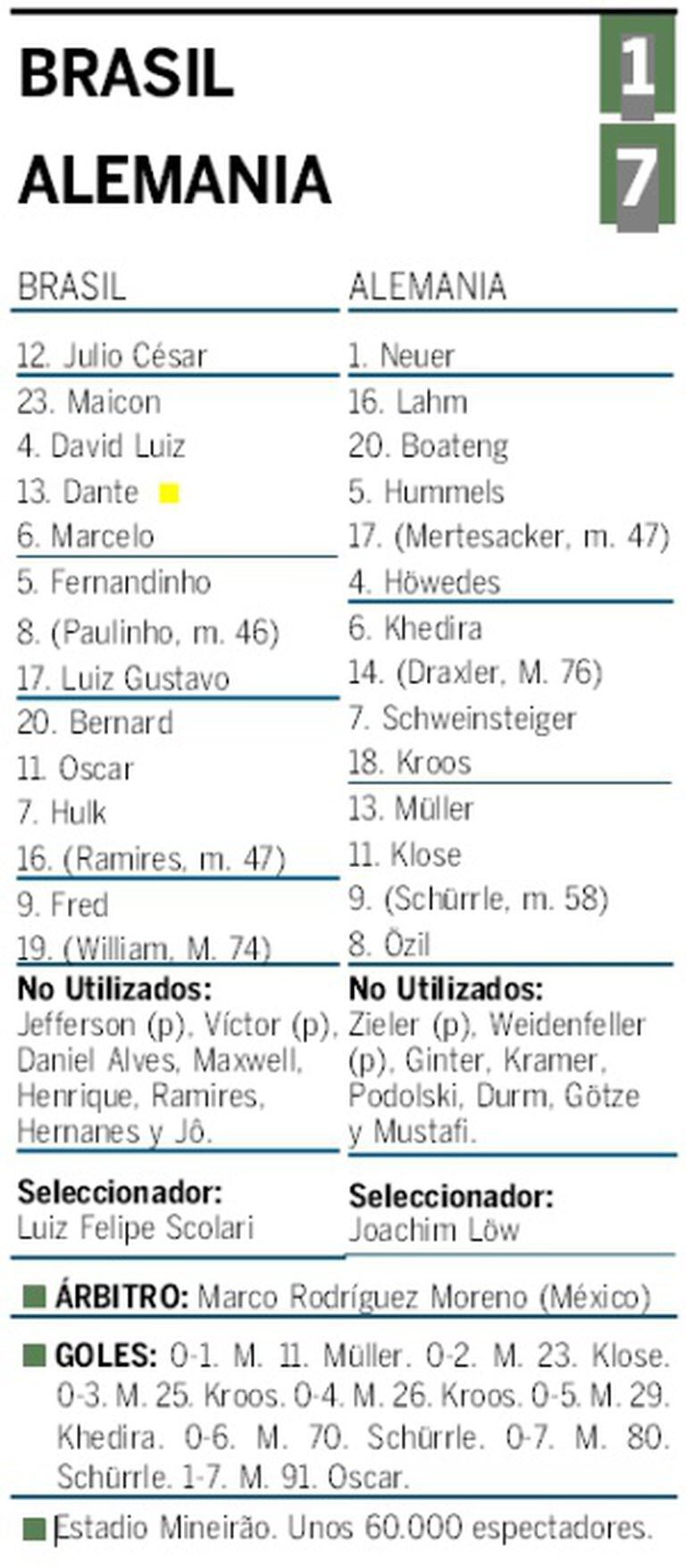 Se fosse sobre um ringue, o duelo teria sido qualificado de massacre. A combustão do Brasil —o hino como um haka maori— e todo tipo de gestos inflamados, durou o que demorou Müller para nocautear a defesa doméstica no primeiro escanteio a favor dos visitantes. Müller, que já soma cinco tentos, arrematou na entrada da pequena área, como se estivesse entre coroinhas. Ninguém lhe fez ao menos cócegas. O gol foi uma sacudida para o Brasil, mas quando Klose marcou o segundo, toda a equipe desmoronou de forma calamitosa. Dois minutos depois chegou o terceiro, de Kroos. Se seu tiro foi prodigioso, a jogada, com seis toques de violino sucessivos, foi digna de museu. A equipe de Löw era uma sinfonia.