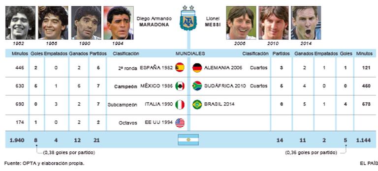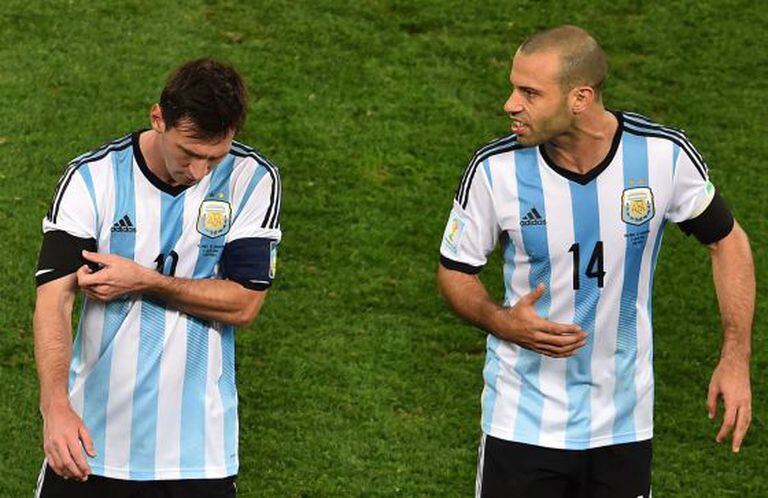 Com Messi, Higuaín, Agüero, Di María, Lavezzi e Palacio na lista, a alviceleste partiu como uma equipe de ataque imponente. Por outro lado, a defesa se arreganhava com Fernández e para Mascherano, com Gago ao lado, lhe custava se adaptar de novo ao posto de pivô depois de seu auxílio como central no Barcelona. Gota a gota, mas no começo do campeonato apareceu o melhor Messi, o autor de quatro gols na fase de grupos. Machucado Agüero, Sabella fez uma boa intervenção, retocou a defesa, com Demichelis pelo frágil Fernández e Biglia tomou a diantera de Gago. Messi se apagou, mas Mascherano cresceu e, com ele, toda a armação. Um pelo outro. O torneio deixou Leo como capitão e seu colega e amigo como general. Aqui está uma das diferenças entre esta Argentina e a de 86. Messi se parece mais ao Maradona de 90, pois se no México cresceram os que rodeavam o mito (Valdano e Burruchaga), no Brasil se agigantaram os pretorianos de Mascherano (de Romero a Bigia ou Pérez, passando por Garay e Demichelis).