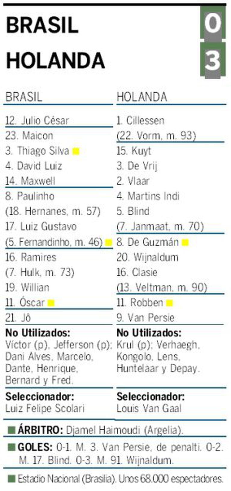 A anfitriã é a seleção-pesadelo para seus torcedores em qualquer campo do Brasil. Embora Felipão tenha trocado meio time, o futebol do Brasil provocou a mesma dor de cabeça que na sua partida contra a Alemanha. Não sabe como sair com a bola nem acabar as jogadas desde que Neymar se lesionou. Carente de meios de toque, seu único recurso é atacar os cruzamentos de bola parada, sobretudo na saída das faltas táticas cometidas de maneira reiterada pela Holanda. Os oranjes não deixaram que os brasileiros alcançassem sua área e foram efetivos diante das traves de Julio César. Tanto faz quem jogue no Brasil: Hulk ou Ramires, Marcelo ou Maxwell, Fred ou Jô, Fernandinho ou Paulinho, Bernard ou Willian. Todos parecem um só nas mãos de Scolari.