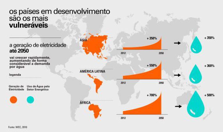 A premissa vale sobretudo para o mundo em desenvolvimento, segundo o Conselho Global de Energia (WEC, na sigla em inglês). A América Latina, por exemplo, é uma das regiões em que a produção de eletricidade mais aumentará até 2050: 550%, fazendo o consumo de água crescer 360%. Só perde para a África, cuja produção de energia subirá 700% até a metade do século, puxando em 500% o uso de água.