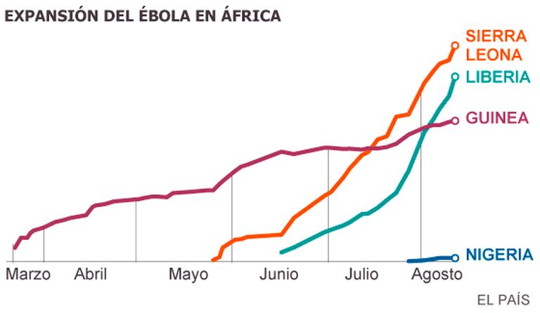 E a projeção dos dados confirma que a velocidade de propagação está muito longe de perder força. Isso pode ser visto nos gráficos, que são em forma de J na Libéria e em Serra Leoa. Na Guiné, que foi a origem do foco —acredita-se que o primeiro infectado tenha sido um menino em Gueckedou em dezembro—, a linha é menos inclinada e mais reta, o que mostra um crescimento sustentável, mas que não se acelera. A Nigéria, que tem apenas 12 casos e é o último país a ser atingido pelo vírus, ainda não apresenta um padrão e parece que se mantém com esse número de infectados, todos eles contatos de Patrick Sawyer, que chegou doente vindo da Libéria em 20 de julho.