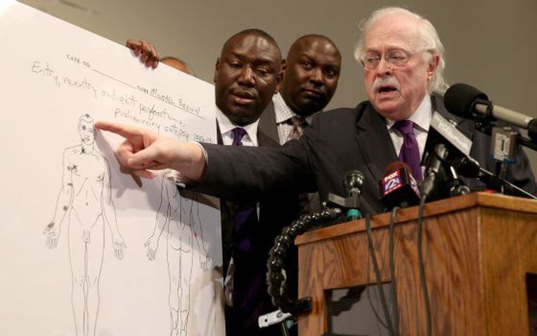O exame foi solicitado pela família e efetuado no domingo por Michael Baden, um legista famoso nos meios de comunicação. A polícia do condado realizou uma primeira autopsia no dia seguinte ao tiroteio, e o Departamento de Justiça anunciou no domingo que fará outra a pedido da família Brown pelas “circunstâncias extraordinárias” do caso. Pessoas próximas ao falecido desconfiam do exame das autoridades locais, porque os primeiros resultados, anunciados na última terça-feira, se limitavam a certificar que o rapaz morreu por disparos, mas não especificava quantos recebeu, anunciando ao final que as conclusões definitivas estariam prontas quatro semanas depois.