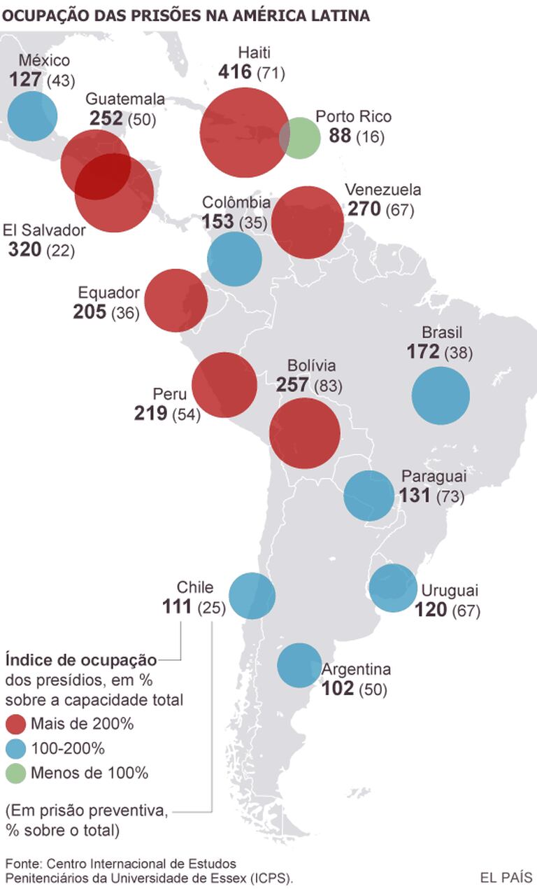 Além disso, entre os dez países cujas prisões são as mais povoadas do mundo, há quatro latino-americanos. O Haiti encabeça a lista, com uma taxa de ocupação carcerária de 416%. Seguem-se El Salvador, em quarto lugar, com 320% de superpopulação; Venezuela (270%) em sétimo; e Bolívia (256%) em oitavo, segundo dados do Centro Internacional de Estudos Penitenciários da Universidade de Essex (ICPS). A superpopulação no Paraguai atinge 131%, mas em seu principal centro, a Penitenciária Nacional de Tacumbú, essa cifra pula para 333%, segundo informes da Defensoria Pública desse país.