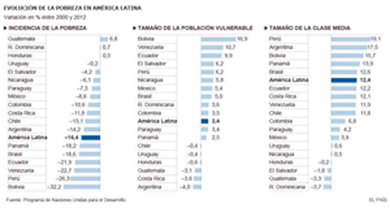 O documento mostra, além disso, que 81,6 milhões conseguiram ascender à classe média – cidadãos com renda per capita diária entre 10 e 112 reais –. Em 2000 eram 99,6 milhões de latino-americanos, 21,9% do total; em 2012 subiram para 181,2 milhões, 34,3%. Também aumentou, ainda que em menor proporção, o número de pessoas cuja renda per capita supera os 112 reais por dia: eram 8,9 milhões em 2000 (2%) e, em 2012, 13,7 milhões (2,6%).
