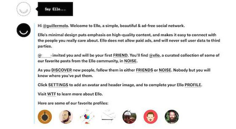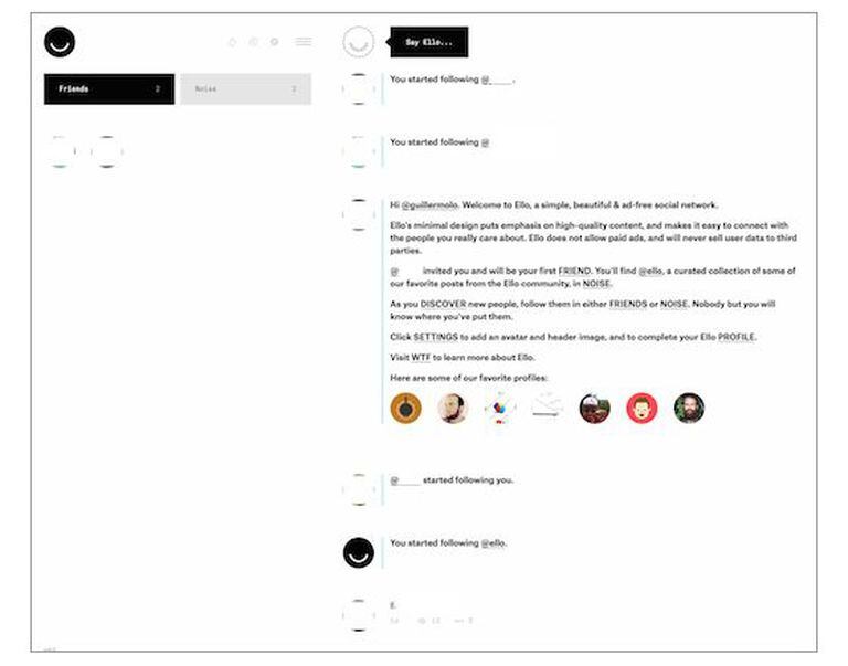 A primeira mensagem encontrada em “Friends” é do usuário @ello. Nela, explica-se com pompa do que se trata: “O Ello é uma rede social simples, bonita e sem publicidade, e seu projeto minimalista enfatiza o conteúdo de alta qualidade”. Uma declaração de intenções mais na linha do conteúdo seleto de um Medium do que uma rede popular como o Facebook.