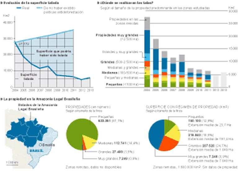 Quase a metade da superfície desflorestada entre 2004 e 2011, ao redor de 36.000 km2 aconteceu em áreas dominadas pelas grandes propriedades, aquelas maiores de 500 hectares. Os pequenos e médios proprietários dividem, em partes iguais, outros 20%. O terço restante do desflorestamento aconteceu no que os pesquisadores chamam de áreas remotas, tão distantes que ali não chega nenhuma autoridade para comprovar de quem é a terra e, menos ainda, sancionar seu mau uso.