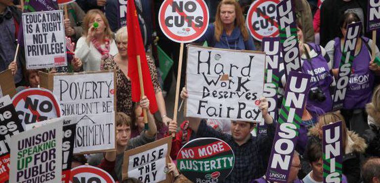 Segundo os sindicatos, os salários caíram 50 libras (196 reais) por semana em termos reais desde 2007, e há 5 milhões de pessoas no país ganhando menos que um salario mínimo. De acordo com um estudo da fundação New Economics, no último ano as famílias britânicas sofreram uma queda de 15% em seu poder aquisitivo, e os salários estão sem reajuste com a inflação desde 2008.