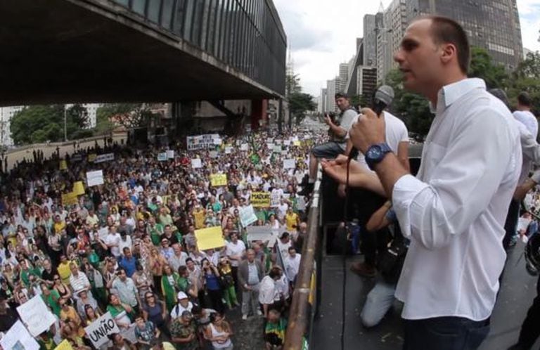 Escrivão da Polícia Federal e filho caçula do militar de extrema direita Jair Bolsonaro (PP) – o deputado mais votado do Rio de Janeiro – Eduardo Bolsonaro (PSC) faz a sua estreia na política abraçado à polêmica que tanto alavancou seu pai. Recém-eleito deputado federal por São Paulo, com 82.224 votos (0,39%), Eduardo apareceu armado no protesto que reuniu, no sábado, cerca de 3.000 pessoas em prol do impeachment de Dilma Rousseff. Ele, junto ao cantor Lobão, exerceu o papel de mestre de cerimônias de uma marcha que mostrou a cara mais conservadora e radical dos eleitores inconformados em ver o PT mais quatro anos no poder. Soltou pérolas como a de que preferiria “votar no Marcola [um dos líderes do Primeiro Comando da Capital] que na presidenta” ou que seu pai “teria fuzilado Dilma Rousseff se fosse candidato."
