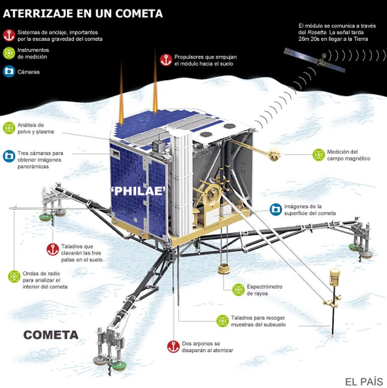 Além de uma minuciosa preparação por parte dos engenheiros e cientistas, a Philae contou com a sorte. “Em Agilkia há rochas e desníveis, e isso que era o ponto mais fácil para possíveis aterrissagens. Precisamos de sorte para não cair em um despenhadeiro ou numa rocha grande”, havia explicado Miguel Pérez Ayúcar, engenheiro de operações da Rosetta no ESAC, poucos minutos antes da confirmação do pouso. A coisa se complicara a partir das primeiras horas da madrugada, quando os encarregados de controlar o módulo de descenso constataram que não houve o acionamento dos pequenos propulsores que deveriam ajudar a nave a minimizar o impacto com o cometa. O resto da manobra foi saindo conforme o previsto. O módulo se separou, girou e abriu as patas durante a descida… e duas horas depois restabeleceu o contato com a Rosetta, e esta com a Terra. Começaram a chegar as primeiras fotos e dados. Especialmente aplaudida foi a da Rosetta fotografada a partir do módulo Philae logo após a separação, e a imagem que a Rosetta tirou da Philae, já com as patas abertas, a certa distância.