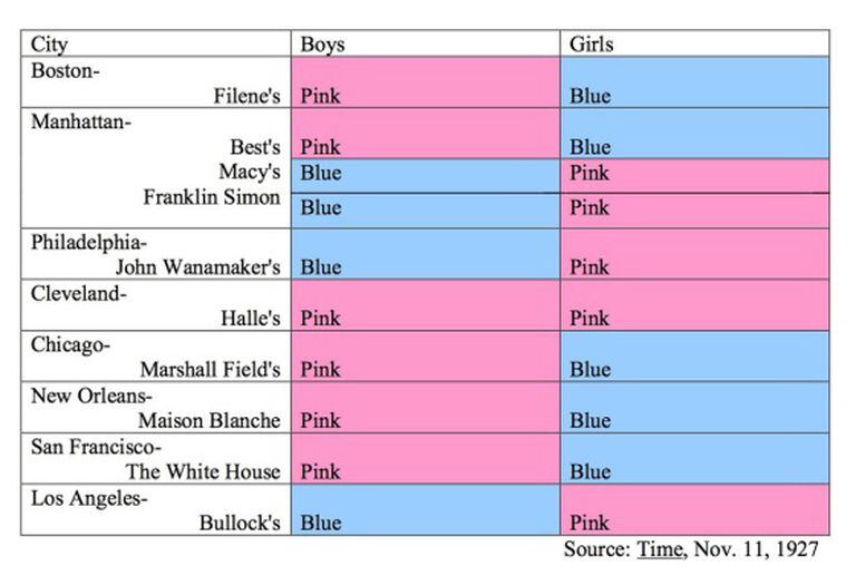 Nos Estados Unidos, a diferenciação atual começa a se instituir depois da Segunda Guerra Mundial. Em 1927, a Time publicou um quadro (também citado por Paoletti) detalhando qual era a oferta preferencial de cores nas lojas de departamentos norte-americanas. Essa tabela reflete que o critério ainda não estava claro (embora claramente houvesse a busca por um). Mas 60% das lojas de departamentos preferiam o rosa para meninos.