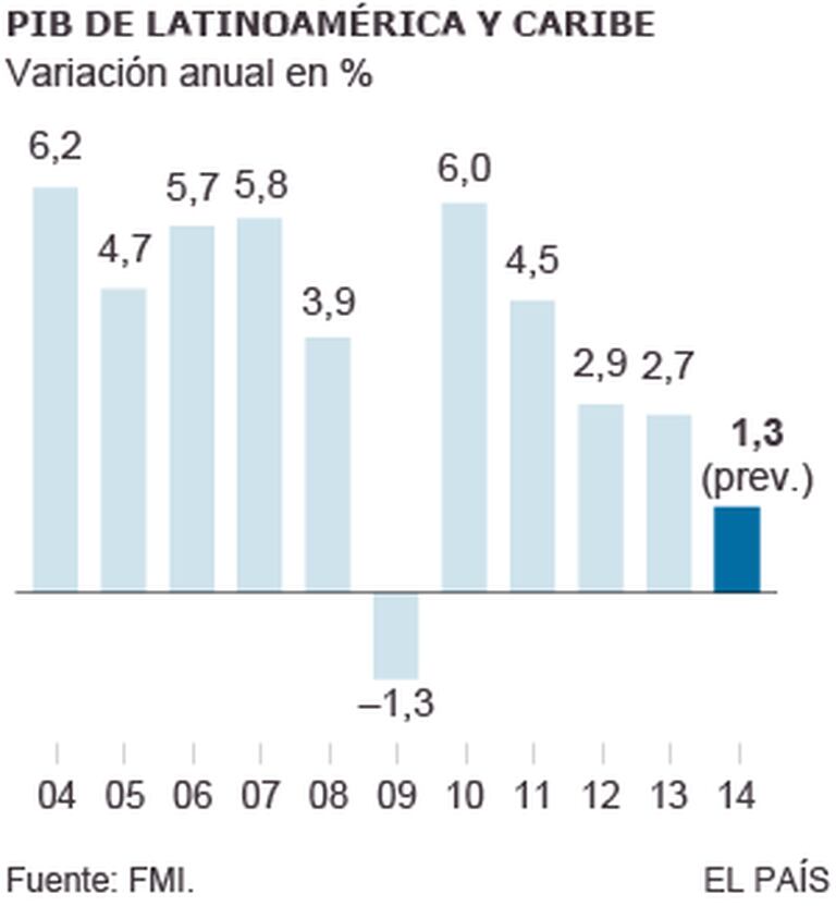 De fato, segundo dados do BBVA Research, a economia latino-americana crescerá 0,9% neste ano e 1,8% em 2015, refletindo a desaceleração da demanda interna e um ambiente externo menos favorável, no qual se destaca a desaceleração da economia chinesa e a menor demanda global por matérias primas. “Na média da região, é provável que o pior da desaceleração já tenha ficado para trás”, diz a instituição em seu último relatório regional de conjuntura, no qual constata também a crescente disparidade entre a Aliança do Pacífico (México, Colômbia, Peru e Chile), que registrará um crescimento de 2,8% e 3,8% em 2014 e 2015, respectivamente, e o Mercosul (Argentina, Brasil, Uruguai, Paraguai e Venezuela), cujo PIB deve se contrair 0,5% neste ano e crescer apenas 0,4% no próximo. Seja como for, a região está longe do crescimento médio de 4,5% que registrou entre 2003 e 2011, segundo o Fundo Monetário Internacional (FMI), e também do ritmo de outras economias de renda similar, como as asiáticas, que registrarão um crescimento médio superior a 7% neste ano.