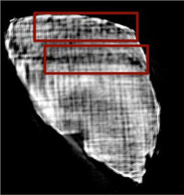 Nas instalações do sincrotron, os cientistas puderam escanear o pergaminho usando uma versão da tomografia computadorizada de raios X (XCT). Muito usada na medicina, essa técnica de imagem se aproveita do fato dos materiais mostrarem índices diferentes de absorção dos raios X. Mas, ainda que seu contraste sirva para diferenciar entre material duro (ossos) e mole (tecidos), não basta para diferenciar um carvão de outro.