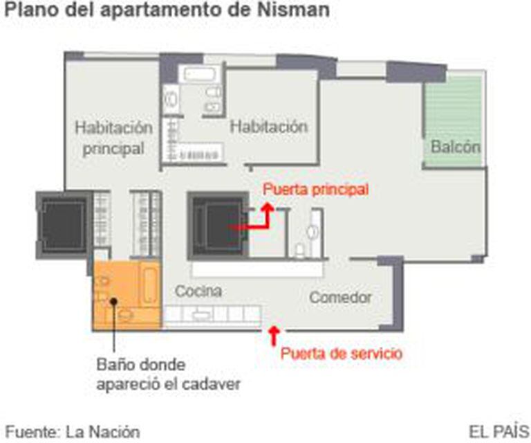 4. Uma passagem para apartamento do promotor. A agência de notícias DyN revelou que os investigadores da morte do promotor descobriram um terceiro acesso ao apartamento de Nisman (além da porta principal e uma porta de serviço, como se pode ver no plano do apartamento). Trata-se, segundo essa informação, de uma passagem que conecta por meio de uma pequena porta metálica o apartamento do promotor a outro apartamento “ocupado por um cidadão estrangeiro, que não é de origem iraniana”. Na passagem, onde estão localizados aparelhos de ar condicionado, foram encontradas uma pegada de aparência recente e impressões digitais, amostras que estão sendo analisadas.