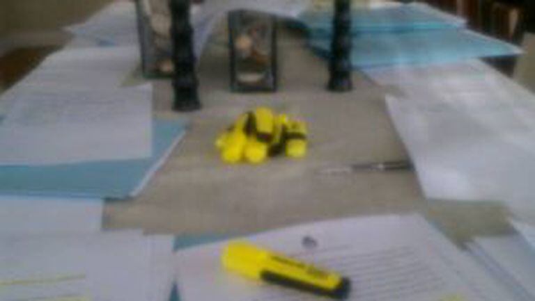 7. A última foto do promotor: seu escritório com a denúncia. Na tarde de sábado, por volta das seis, Nisman envia sua última mensagem conhecida: comunica-se com Waldo Wolff, vice-presidente da DAIA, conforme relata Wolff. Na conversação, pelo WhatsApp, o promotor envia uma foto: nela se vê um escritório no qual se observa abundante documentação organizada em pastas azuis e meia dúzia de marcadores amarelos para estudar a informação. É a documentação que Nisman tinha intenção de apresentar na segunda-feira à Câmara dos Deputados.