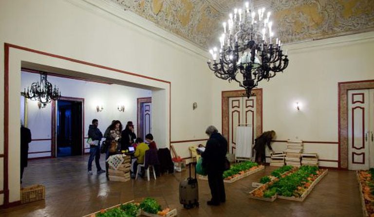 O chão do palácio é ocupado por alfaces e abóboras com aparência de recém-saídos do chuveiro. Um impressionante lustre de cristal ilumina o salão, repleto de dourados, espelhos e afrescos de um tempo passado que, sem dúvida, foi bem melhor. Essa quitanda não é qualquer uma.