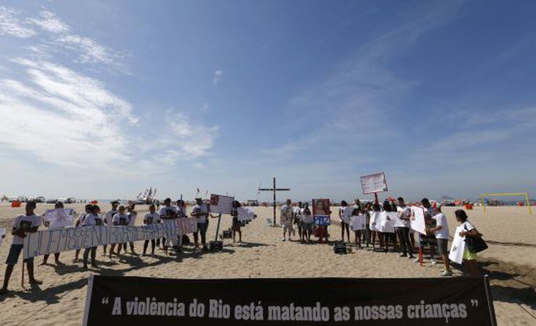 A ONG Rio de Paz organizou no último domingo um ato público na praia de Copacabana para conscientizar a população sobre a morte de crianças por balas perdidas na “cidade maravilhosa”. Com cartazes destacando a frase “a violência está matando nossas crianças”, pais e familiares de menores mortos pediram justiça, ao lado de uma cruz de três metros cravada na areia.