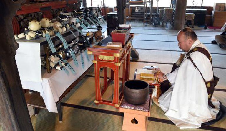Com os 'mortos' de corpo presente, monge recita textos sagrados no templo