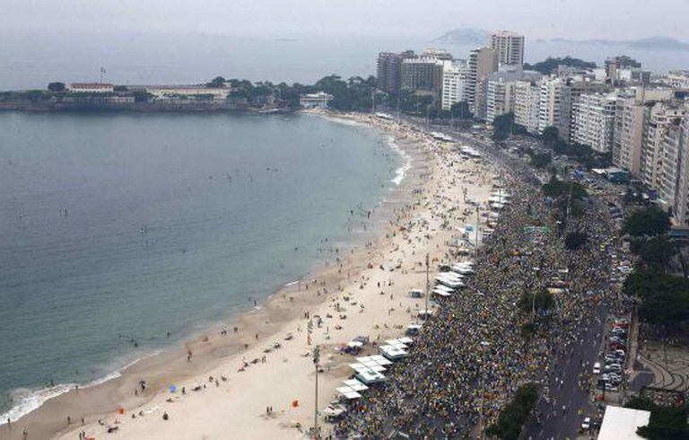 Um mar verde e amarelo de cidadãos –autointitulados "cidadãos de bem”– se mobilizou neste domingo na praia de Copacabana, no Rio de Janeiro, contra o governo da presidenta Dilma Rousseff e o Partido dos Trabalhadores. A passeata, que começou no posto 5 da Avenida Atlântica às 9h30, estava praticamente dividida entre aqueles que foram para demonstrar sua indignação e pedir mais ética na política, e os que exigiam o impeachment de Dilma Rousseff – ainda que o grito geral fosse, com punhos fechados no ar, “Fora Dilma, fora PT!”.