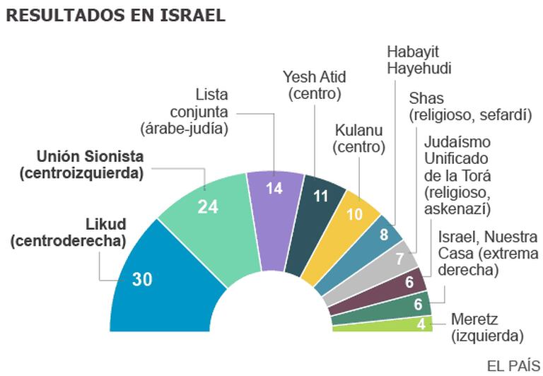 Quando as pesquisas de boca de urna ainda prognosticavam um empate, o presidente de Israel, Reuven Rivlin, recomendou um pacto de grande coalizão entre as duas principais forças. Mas tanto Netanyahu como Herzog desprezaram imediatamente o pedido do chefe do Estado. O líder trabalhista, visivelmente preocupado ao falar para seus partidários, anunciou que vai tentar com todas suas forças constituir um “Governo social” que busque “a paz com os vizinhos”.