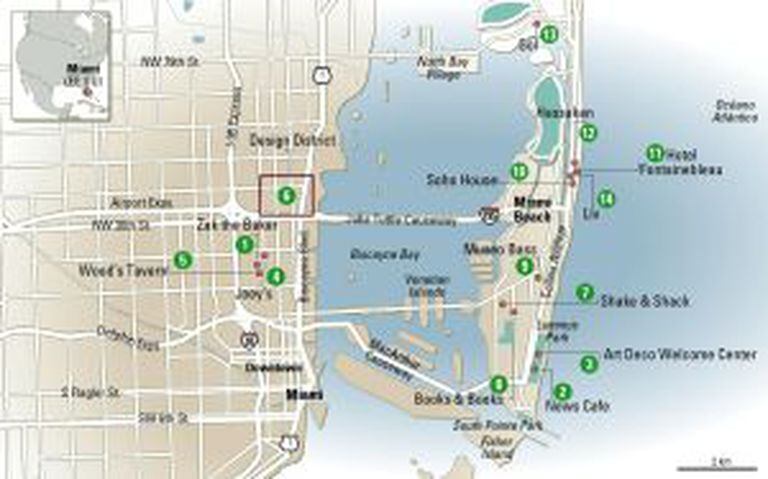 Nada melhor para começar o dia que um farto café da manhã na que é considerada por muitos a melhor padaria de Miami, Zak the Baker (1) (Wynwood Bakery & Cafe; 405 NW, rua 26; zakthebaker.com). O dono, Zak (chamado, simplesmente, The Baker, o padeiro), exibe orgulhoso doces de tradição judaica, pães elaborados para resistir uma semana e massas que encantarão o mais cético. Outra possibilidade para o café da manhã é o News Cafe (2) (800 Ocean Drive), aberto 24 horas. Dali se pode seguir até o número 1001 da mítica avenida, onde está o Art Deco Welcome Center (3) (www.mdpl.org), com toda a informação sobre o roteiro da lendária arquitetura dos anos vinte da cidade.