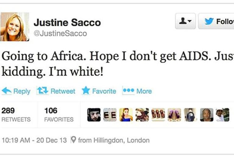 Sacco passou as onze horas seguintes voando até seu destino e, quando aterrissou na Cidade do Cabo e conectou seu celular, recebeu um dilúvio de mensagens, insultos, e também condolências escritas por seus conhecidos; enquanto tentava assimilar o que estava acontecendo, recebeu uma ligação de sua melhor amiga que lhe disse que sua mensagem sobre a AIDS era trending topic mundial, ou seja, a mensagem mais reproduzida no Twitter nas últimas horas. Imediatamente depois seu chefe ligou e, pressionado pelo escândalo nas redes sociais, sobre essa executiva que acabava de demonstrar sua ignorância e seu racismo ao mundo, não teve outro remédio a não ser demiti-la da direção que ocupava em uma importante empresa de comunicação de Nova York. Enquanto Sacco voava até a Cidade do Cabo, uma etiqueta, uma hashtag, sobrevoava o Twitter: #justinejáaterrisou? Dezenas de milhares de pessoas esperavam o momento em que Justine, que tinha somente 170 seguidores quando saiu de Londres, aterrissasse na África do Sul e visse a encrenca na qual havia se metido. Uma pessoa foi ao aeroporto, fotografou Sacco, com vistosos óculos, incrédula, olhando a tela de seu telefone e a publicou no Twitter com a seguinte mensagem: “Sim, Justine já aterrissou no aeroporto da Cidade do Cabo. Decidiu disfarçar-se com óculos escuros”.