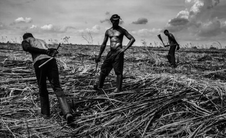 Ao descer do carro, senti a terra queimando sob os meus pés. O relógio marcava 14h37. A temperatura ambiente era de 38°C mas aparentava ser muito maior. No chão, lascas de cana queimadas eram cortadas por três trabalhadores. Eles estavam cortando cana desde as 5h. “Não param para o almoço?”, pergunto. “Ganhamos por produção, então é melhor seguir trabalhando direto até as 16h. Depois descansamos e amanhã começamos novamente”.