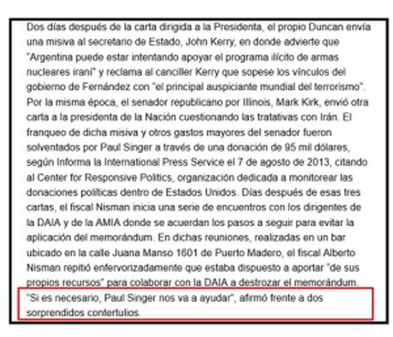 Em um post baseado em artigos da imprensa, sobretudo do jornal Pagina 12 e do israelense Haaretz, e em tom crítico, Kirchner vincula o falecido Nisman a Paul Singer, a quem ela mesma define como “O senhor dos abutres e dono das decisões do juiz Griesa contra a Argentina”. Griesa é o juiz de Nova York que mantém bloqueada a dívida argentina pela pressão desses fundos especulativos.